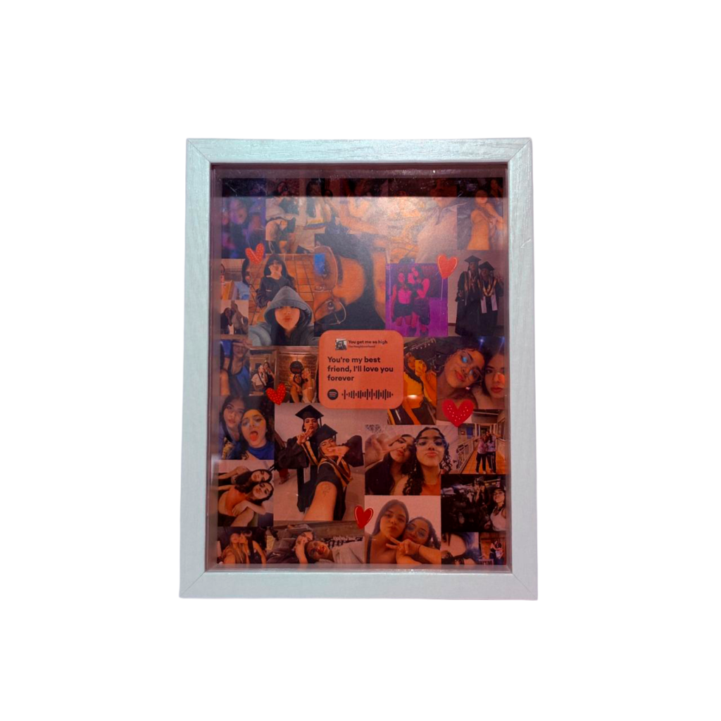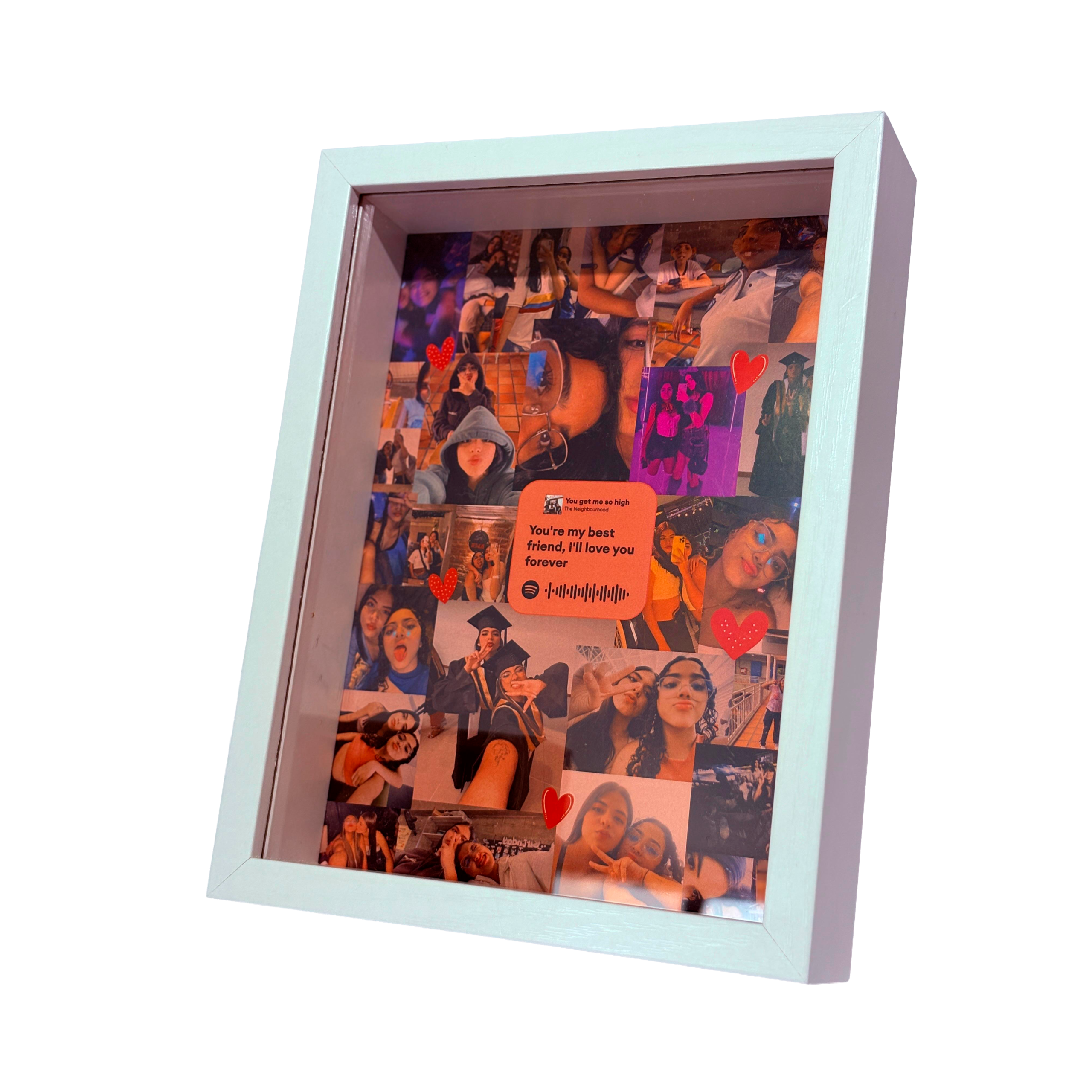 Este cuadro tipo caja 3D en color blanco es el regalo perfecto para inmortalizar momentos inolvidables junto a tu persona favorita. Diseñado para resaltar tus recuerdos más preciados, cuenta con un hermoso collage personalizado decorado con corazones y una placa central estilo reproductor de música con código de Spotify dedicable, ideal para expresar tu cariño a través de una canción especial y una frase emotiva.