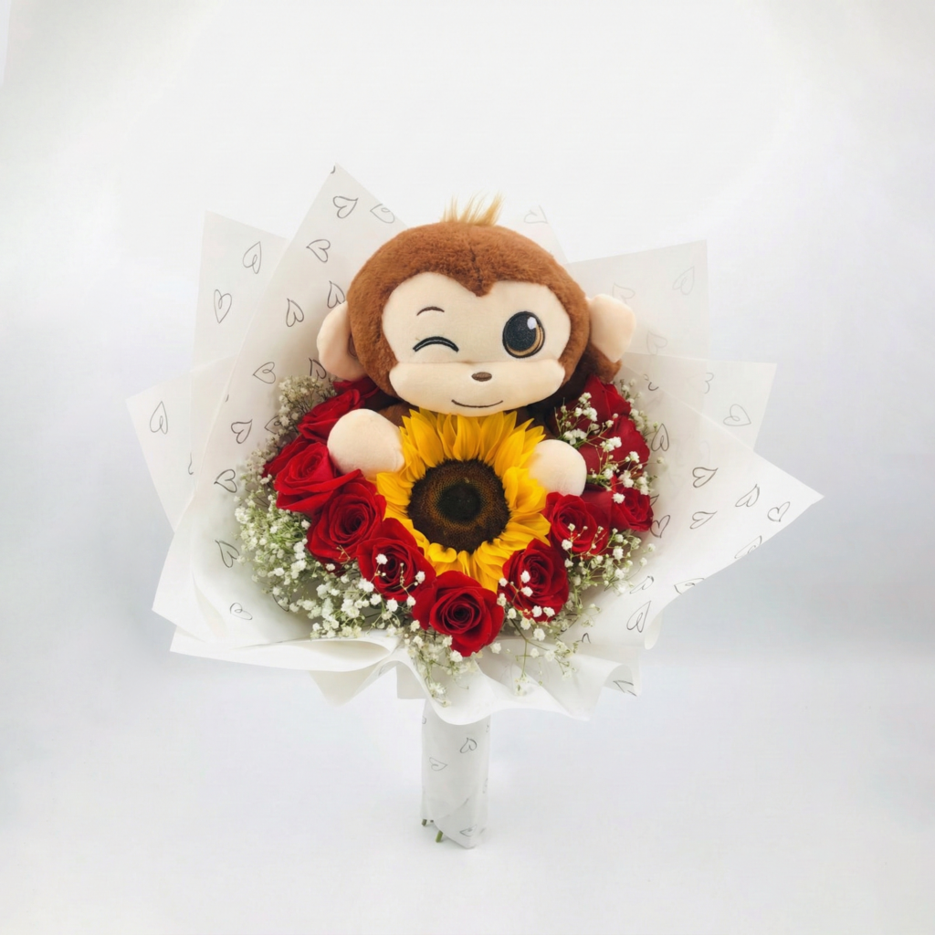 Este bouquet de mano está envuelto en un elegante papel decorativo blanco con estampado minimalista de corazones negros. La composición floral incluye un girasol grande y radiante en el centro, rodeado por aproximadamente 8 a 10 rosas rojas frescas y abundante follaje de Gipsófila (lluvia de plata o ilusión) que aporta volumen y delicadeza. En el centro del arreglo se integra un peluche suave en forma de miquito (monito) con expresión guiñando un ojo, creando un punto focal divertido y tierno.